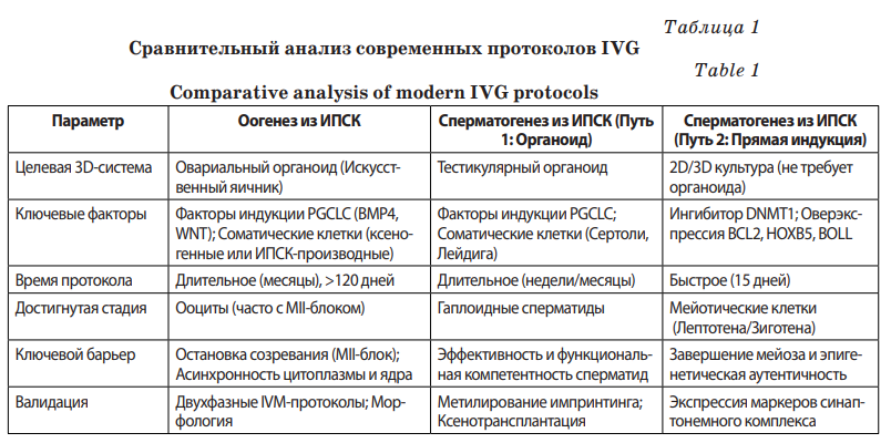 Для обработки данных применялся сравнительный анализ сопоставления эффективности, ограничений и рисков различных протоколов (например, оогенез и сперматогенез; in vivo ниша и in vitro органоид). Контент-анализ использовался для систематизации ключевых биологических и регуляторных барьеров. Авторский синтез применялся для формирования выводов о трансляционном разрыве между успехами в доклинических моделях грызунов и фундаментальными проблемами в исследованиях на клетках человека.