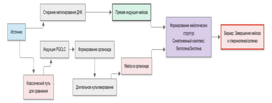 Оогенез из ИПСК в овариальном органоиде с индукцией PGCLC (BMP4, WNT) и соматической поддержкой требует длительных протоколов (>120 д) и часто завершается MII-блоком из‑за рассинхронизации цитоплазмы и ядра; валидация — двухфазный IVM и морфология. Тестикулярный органоид (путь 1) при участии соматических клеток даёт гаплоидные сперматиды за недели — месяцы, но ограничен низкой эффективностью и сомнительной функциональностью (валидация: импринтинг, ксенотрансплантация). Прямая индукция (путь 2) в 2D / 3D быстрый (~15 д), использует ингибиторы DNMT1 и оверэкспрессию BCL2/HOXB5/BOLL, приводит к мейотическим клеткам (лептотена / зиготена), но остаётся проблема завершения мейоза и эпигенетической аутентичности (валидация: маркеры синаптонемного комплекса). На рис. 1 представлена схема новейшего протокола прямой индукции мейоза.