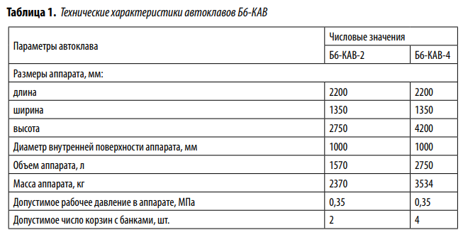 Автоклавы Б6-КАВ-2 и Б6-КАВ-4 используются для стерилизации широкой номенклатуры консервов при температуре свыше 100°C. В табл. 1 приведены основные технические характеристики данных автоклавов [9].