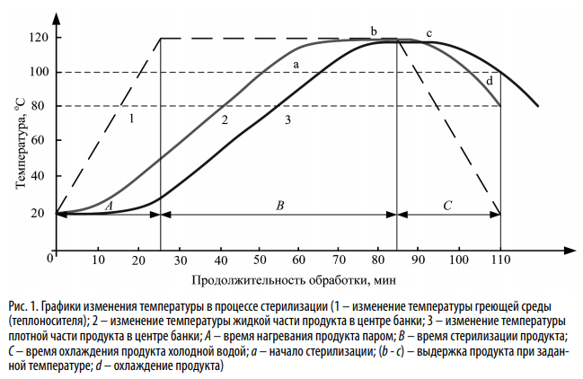 Изменение температуры во время технологического процесса показано кривыми на рис. 1 [4]. Повышение по времени температуры в банке отстает от повышения температуры среды в автоклаве, а при неверно выбранных режимах может и не достигнуть заданного значения. Величина отставания во многом зависит от скорости прогрева продукта. Как правило, быстрее прогревается жидкая часть продукта, в которой теплопередача происходит путем конвекции. Для твердой части отставание более значительно, так как теплопередача здесь определяется в основном теплопроводностью.