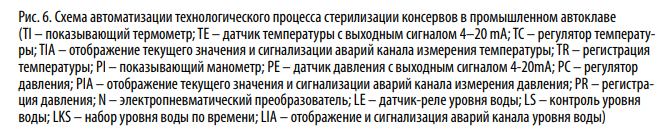 На рис. 6 представлена структура с указанием комплекса технических средств для реализации системы автоматического управления технологическим процессом стерилизации консервов в промышленном автоклаве [16]. Система в автоматическом режиме выполняет все стадии технологического процесса: заполнение автоклава водой, ее подогрев, подъем температуры и давления до значений, заданных формулой стерилизации, собственно стерилизацию и охлаждение продукта.