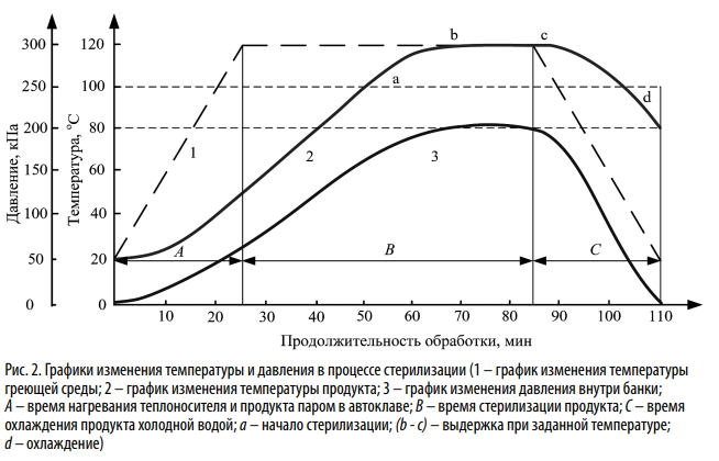При стерилизации температура продукта в консервах постоянно изменяется, причем неравномерно по объему банки. В периферийной части нагрев происходит быстрее, а в центре банки медленнее. Поскольку температура в холодной точке является функцией температуры греющей среды, то график прогрева «холодной» (критической) точки тесно связан с графиком изменения температуры греющей среды в автоклаве [5].