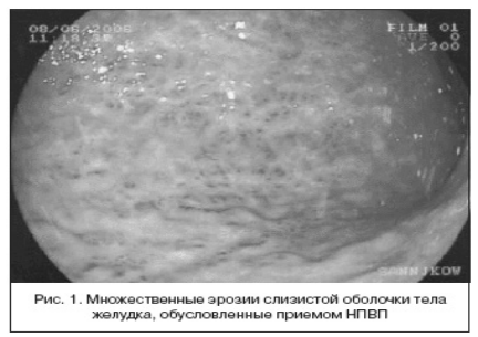 В отличие от H. pylori — ассоциированной язвенной болезни, при которой характерным фоном язвы является хронический активный гастрит — при НПВП–гастропатии язвы могут выявляться при минимальных воспалительных изменениях гастродуоденальной слизистой оболочки [5].