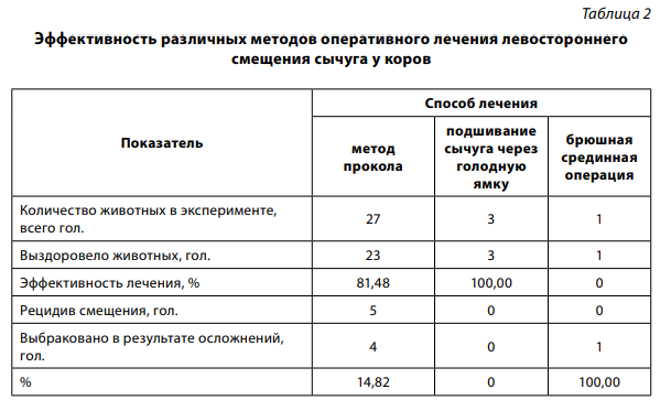 Цель наших исследований – изучение сравнительной эффективности различных способов лечения левостороннего смещения сычуга у коров и первотелок.