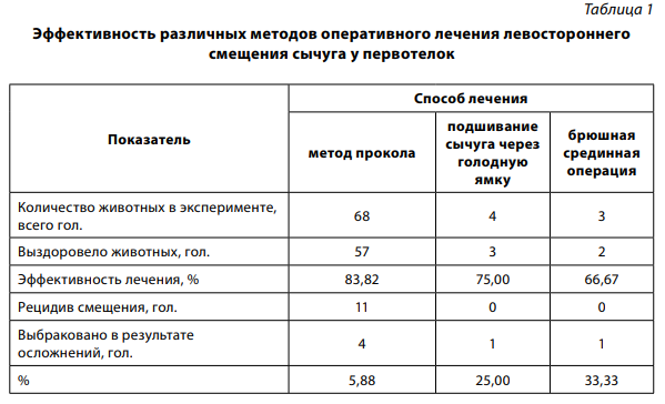 Установлено, что в наибольшей степени патология регистрируется у первотелок. Так, встречаемость левостороннего смещения сычуга за период исследования наблюдали у 75 первотелок и 31 коровы. При изучении эффективности различных методов оперативного лечения смещения сычуга нами отмечены как преимущества, так и недостатки.