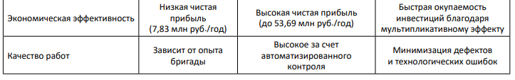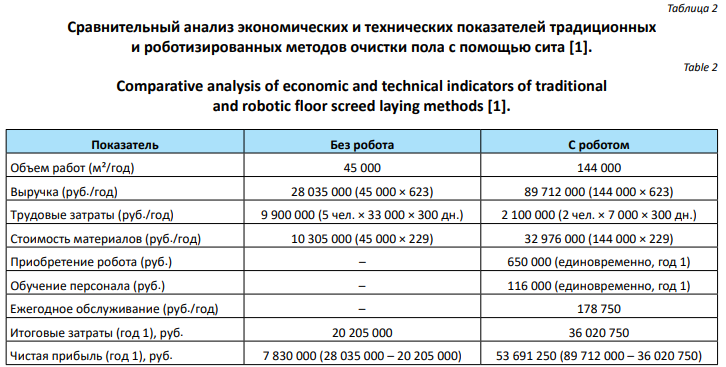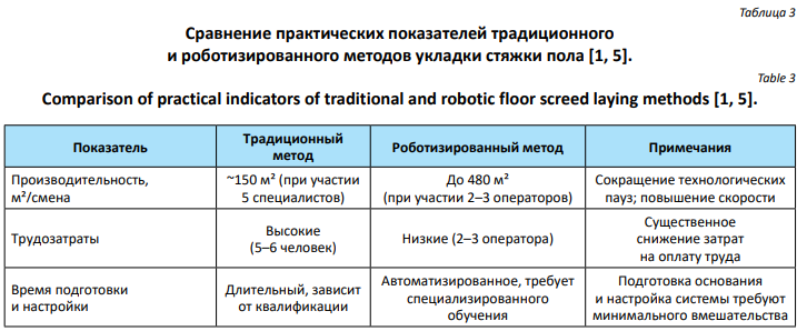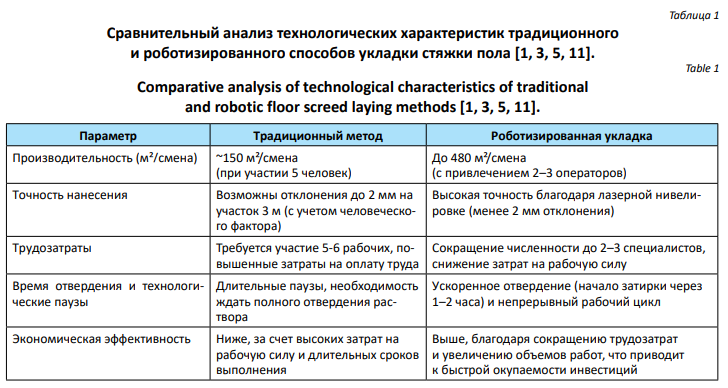 Для наглядного представления различий между традиционными и роботизированными методами укладки стяжки пола приведена табл. 1, в которой сопоставлены ключевые технологические и экономические параметры, используемые в расчетной модели.