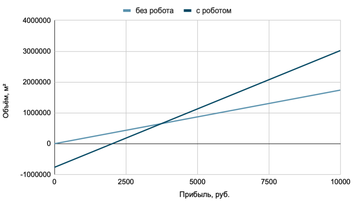 Из рисунка видно, что при объеме 2 000 м² робот все еще в минусе (–8 000 руб.), а где-то в диапазоне 3 700–3 800 м² выгода от роботизации превышает итоговую прибыль при использовании только бригады.
