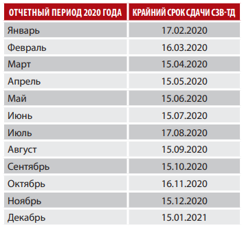 Отчетные даты для СЗВ-ТД в 2020 году с учетом переносов представлены ниже: