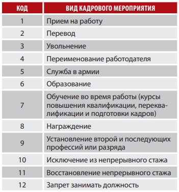 В графу 7 табличной части СЗВ-ТД нужно занести код из этой таблицы. Текстовая расшифровка кадрового мероприятия не требуется.