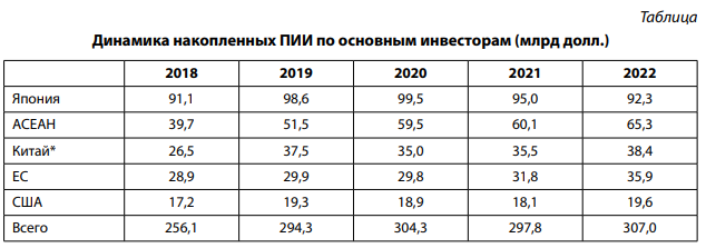 Как видно из таблицы, США входят в число крупнейших инвесторов в Таиланде. Ведущим инвесторов с серьезным отрывом от прочих выступает Япония, далее следуют страны АСЕАН. По объему накопленных инвестиций США занимают пятое место. В ковидные годы наблюдался отток капитала всех крупнейших инвесторов, за исключением стран АСЕАН.