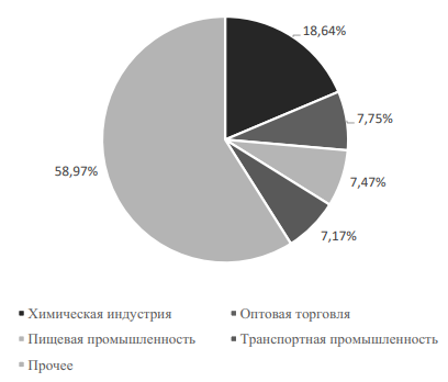 Американские инвесторы занимаются поддержкой разных отраслей экономики Таиланда. В структуре ПИИ из США лидирующие позиции занимает химическая индустрия, на которую приходится 18,64 %, а также оптовая торговля (7,75 %), пищевкусовая (7,47) и автомобильная промышленность (7,17 %) (рис. 7) [17].