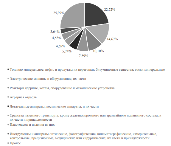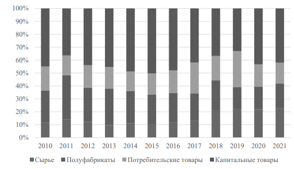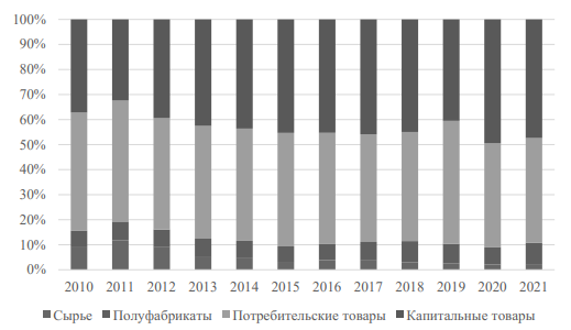 В товарной номенклатуре импорта из США очевидно преобладание средств производства, однако их доля постепенно сокращается — с 44,5 до 34,6 %. Внушительные позиции занимают сырьевые товары с тенденцией к росту. В 2010–2021 гг. они возросли с 11,5 до 25,7 % (рис. 5) [12].