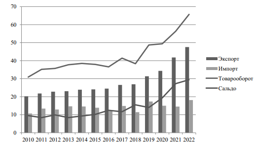 Динамичное наращивание торговых связей обусловлено прежде всего интенсификацией двусторонней торговли, проявляющейся в высоких темпах ее роста в последние годы. Так, в 2019–2022 гг. они составили 11 %. Наибольшей динамикой отличается именно этот период.