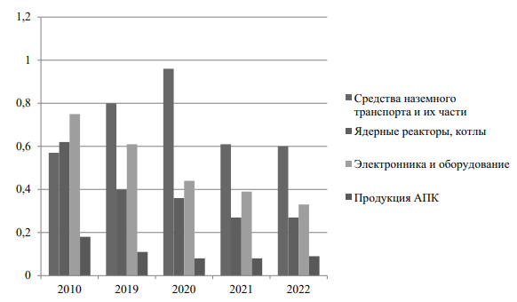 Анализ поставок электроники и оборудования по соотношению внутри- и межотраслевой торговли показал, что в последние годы происходит трансформация и преобладает вторая, а это говорит о достаточно низкой степени интеграции в этой сфере. Об этом свидетельствует неуклонно снижающийся индекс Грубеля-Ллойда. Так, в 2010–2022 гг. он сократился почти вдвое — с 0,75 до 0,33. Примечательно, что снижение внутриотраслевой торговли происходило в последние годы (рис. 4).