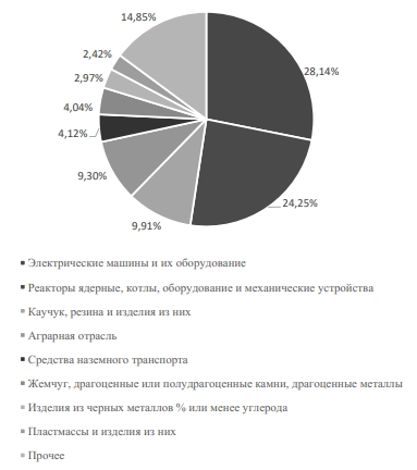 Третье место в структуре экспорта в США занимает каучуковая отрасль. На нее приходится 9,9 % (см. рис. 3). Таиланд обладает сравнительными преимуществами по данной товарной группе и выступает одним из крупнейших мировых производителей и поставщиков наряду с Индонезией. Так, в 2020 г. вместе они экспортировали 56 % от всех поставок натурального каучука в мире [8].