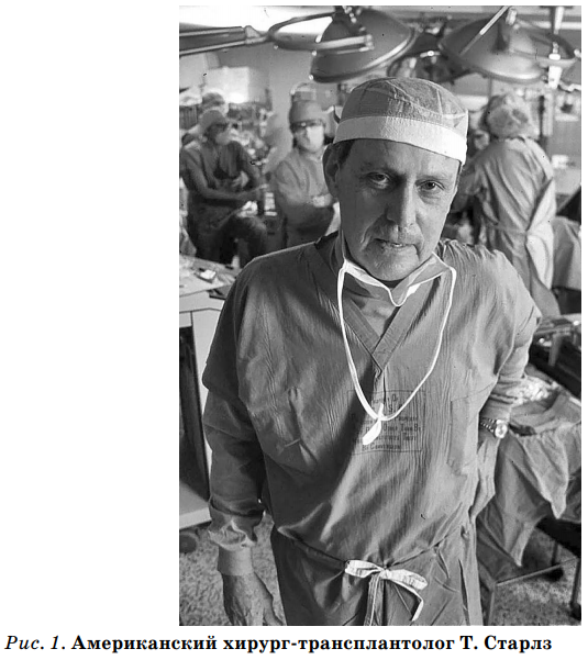 В 1958 году Ф. Мур описал методику ортотопической трансплантации печени у собак. Первую пересадку печени у человека после большой экспериментальной работы провел 1 марта 1963 года американский хирург Т. Старлзом в Университете Колорадо (Денвер, Колорадо) (рис. 1). Пациент умер от кровопотери. В течение следующих трех лет он выполнил еще пять операций, но реципиенты не жили дольше 7 месяцев. В 1967 году Т. Старлз впервые применил антилимфоцитарную сыворотку и смог осуществить успешную трансплантацию печени.