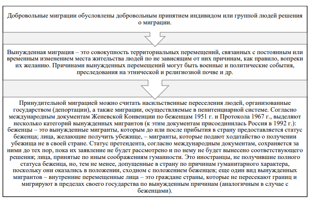 Шестым признаком миграции являются способы вовлечения. Исходя из данного постулата, в качестве отдельных видов миграции можно рассматривать три вида миграции: добровольная, вынужденная, принудительная (рис. 3).