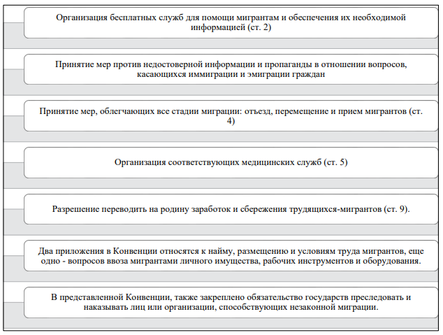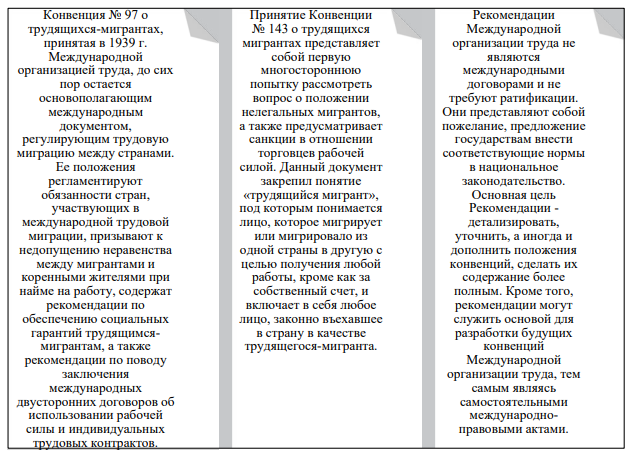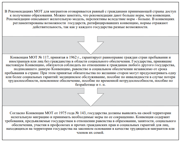 Миграционная политика государств, как правило, базируется на конвенциях и других актах системы ООН, на документах континентального и регионального уровня, где к специальным конвенциям, непосредственно затрагивающим вопросы обеспечения социально-трудовых прав мигрантов, относятся соглашения Международной организации труда. Главное место среди них занимают конвенции МОТ № 977 о трудящихся мигрантах 1949 г. и № 1438 о злоупотреблениях в области миграции и об обеспечении трудящимся мигрантам равенства возможностей обращения 1975 г., а также дополняющие их Рекомендации (рис. 8).