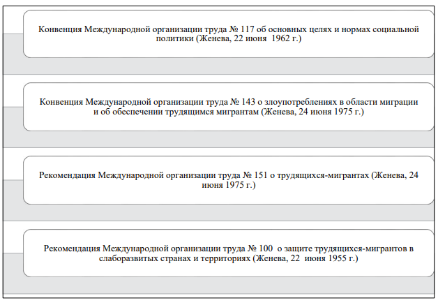 МОТ является важнейшим актором в системе ООН, влияющим на регулирование миграции. Наибольшее значение для защиты иностранных мигрантов имеют, конвенции и рекомендации МОТ, перечисленные на рисунке 11.