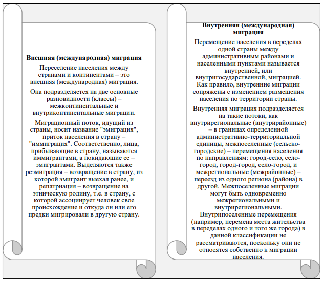 Вторым признаком миграции является географический или пространственный признак, именно он позволяет выделить еще два типа миграции— внешняя и внутренняя. Критерием которых является пересечение любых административных или государственных границ (рис. 2).