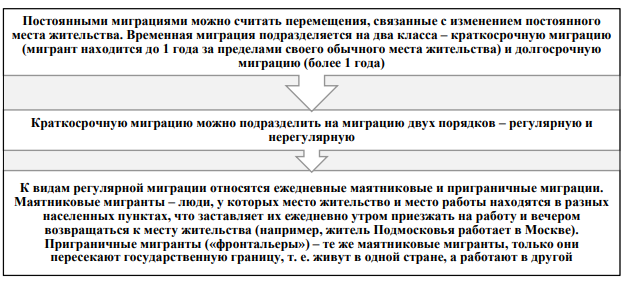 Однако, опираясь на основные критерии и признаки идентификации миграции [расстояние (пересечение границы), время и причины], можно классифицировать миграционные процессы следующим образом.