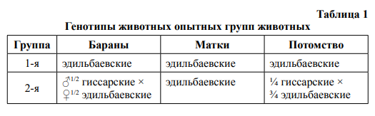 Материал и методика исследований. В условиях селекционно-генетического центра ООО «Волгоград-Эдильбай» проведен опыт по сравнению потомства от чистопородного разведения овец эдильбаевской породы и скрещиванию маток эдильбаевской породы с помесными баранами гиссарской породы (табл. 1).