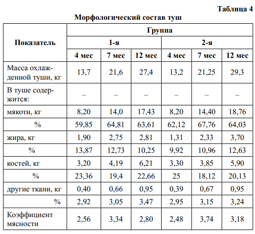 Разделка туш с целью определения морфологического состава показала превосходство помесей по выходу мякоти на 2,27 % в 4 мес, 2,95 % – в 7 мес и 0,42 % – в 12 мес над чистопородными сверстниками. Наибольшим коэффициентом мясности – 3,74, характеризуются помеси в 7-месячном возрасте (табл. 4).