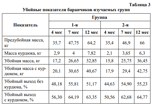 В целом туши помесных баранчиков были массивными, имели округлую компактную форму, подкожный жир равномерным слоем покрывал всю поверхность туши. Присутствовали курдючные жировые отложения, которые составили 2,1 кг в 4 мес, 3,65 кг – в 7 мес, 6,3 кг – в 12 мес.