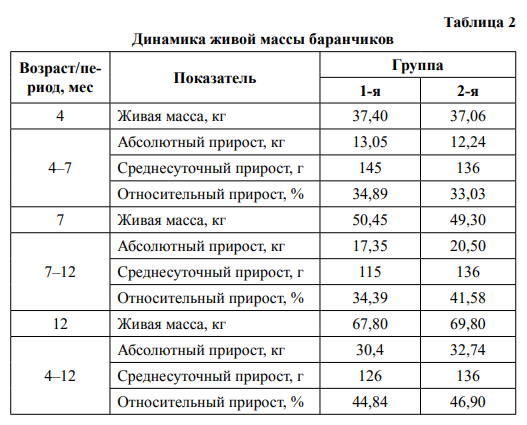 Результаты исследований показали высокую энергию роста помесных баранчиков. Помесные ягнята в первых двух возрастных периодах незначительно уступали по живой массе своим чистопородным сверстникам: при отъеме на 0,34 кг, в возрасте 7 мес – на 1,15 кг, но имели преимущество в возрасте 12 мес на 2 кг.