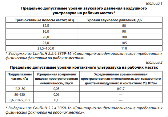 Основой профилактики неблагоприятного воздействия ультразвука на специалистов, обслуживающих ультразвуковые установки, является гигиеническое нормирование. Нормируемыми параметрами воздушного ультразвука являются эквивалентные уровни звукового давления в децибелах в третьоктавных полосах со среднегеометрическими частотами 12,5; 16; 20; 25; 31,5; 40; 50; 63; 80; 100 кГц, измеренные на заданном интервале времени при работе источника ультразвука [8] (табл. 1).