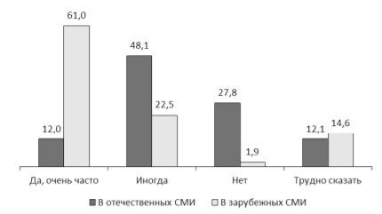 Особенное значение в процессе формирования представлений о Великой Отечественной войне имеют средства массовой информации, которые, однако, не всегда достоверно отображают исторические события. Этот факт подтверждают мнения респондентов, опрошенных в 2015 году. В большинстве ответов отмечается наличие фактов искажения истории войны 1941– 1945 годов в некоторых публикациях в печати, передачах телевидения и радио. В значительно большей степени это относится к зарубежным средствам массовой информации, цель которых — обесценить роль нашей страны в Победе во Второй мировой войне. В этом уверены 61,0% респондентов, отметивших позицию «да, очень часто». Тем не менее 12% россиян указали на частое искажение истории Великой Отечественной войны отечественными СМИ (рис. 4).