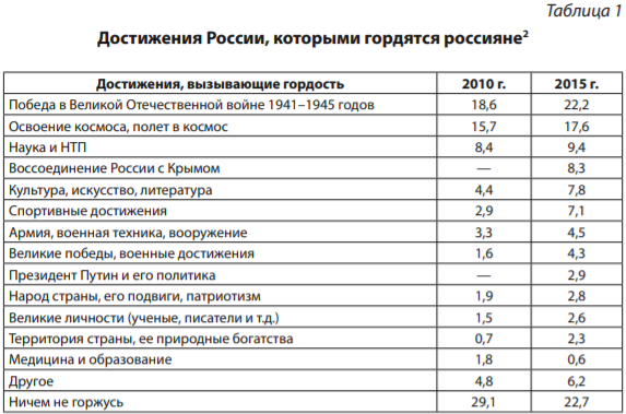 Результаты социологического мониторинга показывают, что Победа в войне 1941–1945 годов является самым значимым событием в истории нашего Отечества и неизменно занимает первое место среди достижений страны, которыми гордятся россияне (табл. 1).