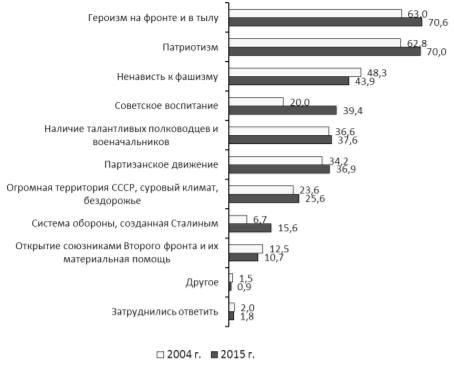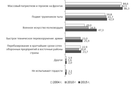 В целом данные опроса демонстрируют, что для разных поколений россиян, представителей различных социальных слоев роль тружеников тыла и подвиг фронтовиков являются доминирующими обстоятельствами, вызывающими чувство гордости, что говорит об устойчивости и преемственности исторических представлений о Великой Отечественной войне, несмотря на различные попытки реконструкции событий военных лет в 1990-е годы.