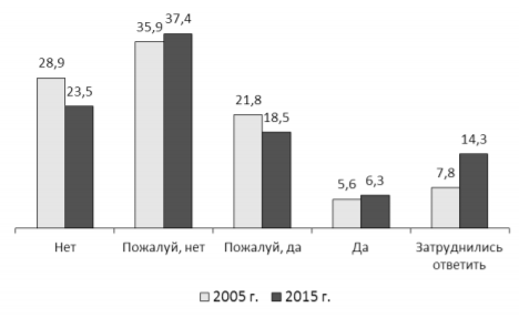 Массовое распространение фашизма на европейской территории в 1930-е годы привело к началу Второй мировой войны, гибели миллионов людей, разрушению сел и городов. Как показывает опрос, у российского населения сегодня, по прошествии 70 лет, отношение к фашизму резко негативное. На этом фоне весьма тревожным сигналом могут служить данные, что четверть россиян опасается массового распространения идеологии фашизма на территории современной России (рис. 7).