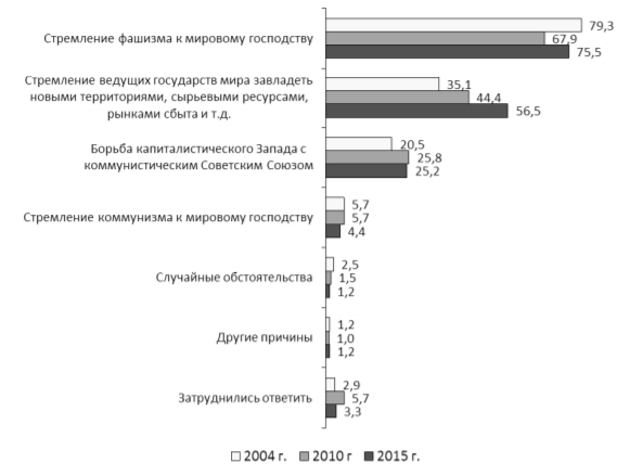 В последние годы в некоторых западных странах усиливаются попытки возложить равную ответственность за начало Второй мировой войны на СССР и Германию. Победа в войне преподносится не как освобождение европейских стран от фашистского режима, а как оккупация Советским Союзом этих территорий. По данным опроса, россияне практически единодушно возлагают ответственность за это роковое событие XX века на фашистский режим, установившийся в то время в Германии. В числе основных факторов начала войны большая часть респондентов (75,5%) указали на стремление фашизма к мировому господству.