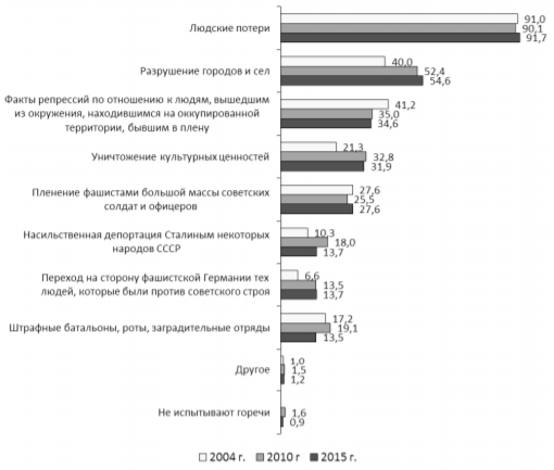 Значительное место в сознании россиян занимает тема репрессий в годы войны. Факты репрессий по отношению к людям, вышедшим из окружения, находившимся на оккупированной территории, бывшим в плену, беспокоят 34,6% респондентов. Кроме того, данные опроса показывают, что такие неприятные события войны, как пленение фашистами большой массы советских солдат и офицеров, переход на сторону фашистской Германии тех людей, которые были против советского строя, насильственная депортация Сталиным некоторых народов СССР, штрафные батальоны, роты, заградительные отряды, прочно укрепились в сознании людей и вызывают чувства горечи и боли.