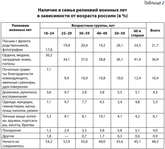 В укреплении и обогащении исторической памяти о Великой Отечественной войне важное место занимает роль семейных ценностей и символов той эпохи. Опрос показывает, что различные реликвии и атрибутика Великой Отечественной войны сохранились только у половины российских семей. Это прежде всего ордена, медали, нагрудные знаки, погоны (36,9%), а также письма с фронта, фотографии (21,7%). В меньшей степени респонденты отмечают наличие дневников и воспоминаний (4,3%), одежды (5,3%), личных вещей (6,1%).
