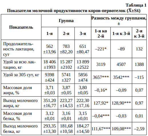 В связи с этим большой интерес представляет изучение молочной продуктивности коров, происходящих от быков-производителей голштинской породы. На основании проведенных исследований было выявлено, что по продолжительности лактации 2-я группа первотелок группа достоверно превосходила 1-ю на 221 сут при Р > 0,95 (табл. 1).