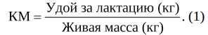 Для установления связи между живой массой коров и их удоем рассчитывали коэффициент молочности (КМ) по формуле (1):