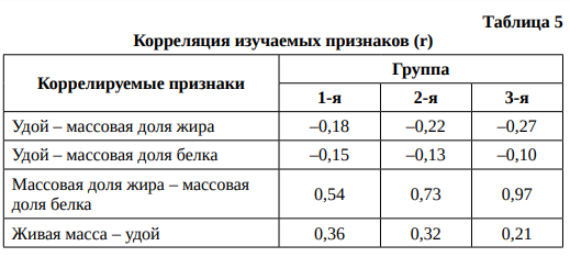4. Во всех подопытных группах коров была выявлена отрицательная корреляция между удоем молока и массовой долей жира и белка в молоке. Корреляция между процентным содержанием белка и жира в молоке, а также между живой массой и удоем, напротив, – положительная.