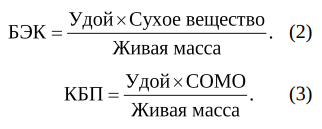 Биологическую эффективность (БЭК) и биологическую полноценность (КБП) коровы оценивали по формулам (2 и 3) В. Н. Лазаренко (1990) и О. В. Горелик (1999):