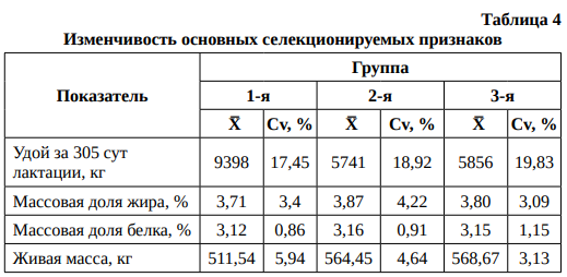 Согласно данным таблицы 4, наибольшей изменчивостью удоя за 305 сут лактации характеризовалась 3-я группа коров 19,83 % против 17,45 и 18,92 % в 1-й и 2-й группах. По массовой доле жира наибольшей вариабельностью отличались первотелки 2-й группы. Массовая доля белка – единственный из учтенных нами признаков, отличающийся наименьшим разнообразием в группах. По живой массе наиболее высокие показатели изменчивости были характерны для животных 1-й группы.