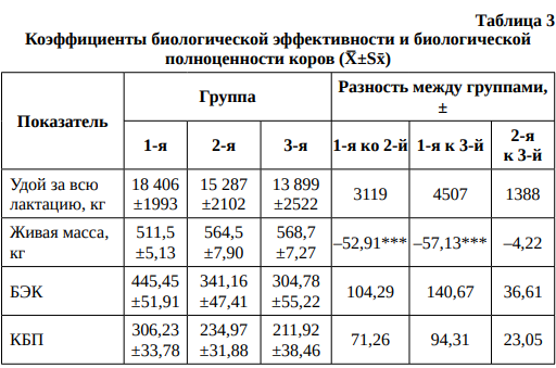 Коэффициенты биологической эффективности (БЭК) и биологической полноценности коров (КБП) показывают, сколько животное производит сухого вещества и сухого обезжиренного остатка молока в процентах на единицу своей массы (табл. 3).