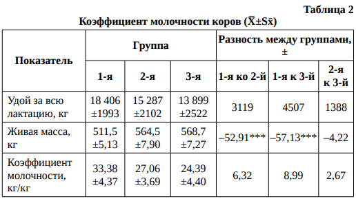 Коэффициент молочности коров 2-й и 3-й групп, несмотря на высокую живую массу, был ниже показателя сверстниц 1-й группы, отличающихся меньшей живой массой. Следовательно, они не реализовали в полной мере физиологические возможности по молочной продуктивности.