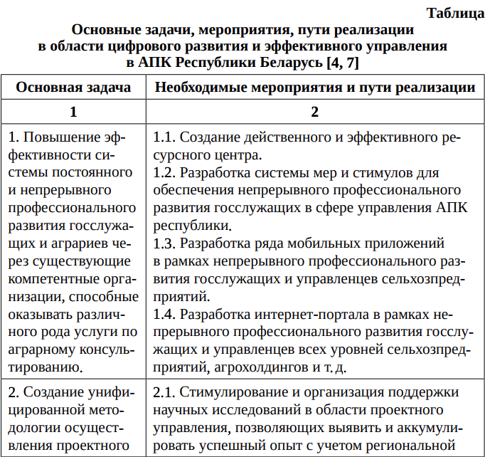 Основные задачи, мероприятия и пути по их реализации в области цифрового развития и эффективного управления в сельском хозяйстве Республики Беларусь кратко и для наглядности представлены в таблице.