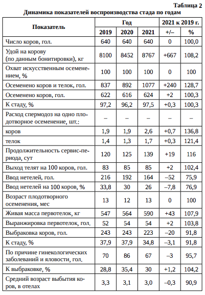 В СХПК «Пламя» при работе со стадом используется только искусственное осеменение. Выход телят увеличился на 102,4 %, или на 2 теленка. Среднее количество осеменений на одно плодотворное равно среднему расходу семени и составляет за период 2,1 дозы. В 2021 г. отмечена максимальная доля осемененных животных и расход семени в этом году – максимальный (2,2 дозы) (табл. 2).