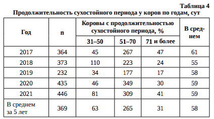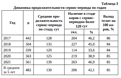 С 2017 по 2021 г. в стаде хозяйства продолжительность сервис-периода колебалась от 128 до 140 сут. Лучший показатель был отмечен в 2019 г. В среднем по стаду за пятилетний период наблюдалось увеличение продолжительности сервиспериода на 12 сут к данным 2017 г.