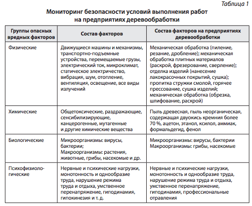 Как правило, в большинстве случаев специфика трудовой деятельности в деревообработке определяется технологией производственных процессов, используемым оборудованием, степенью автоматизации и механизации, что обуславливает спектр и интенсивность воздействия неблагоприятных факторов (табл. 1).