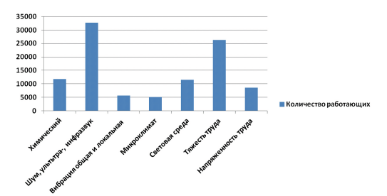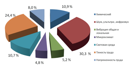 Установлено, что наибольшее количество работающих в сфере деревообработки подвергаются воздействию таких факторов, как шум, ультра- и инфразвук, а также химическому фактору и фактору — тяжесть труда. Процент общего числа работающих на деревообрабатывающих производствах и подвергающихся воздействию опасных и вредных производственных факторов указывает на аналогичную тенденцию (рис. 2) [6, 7].
