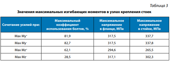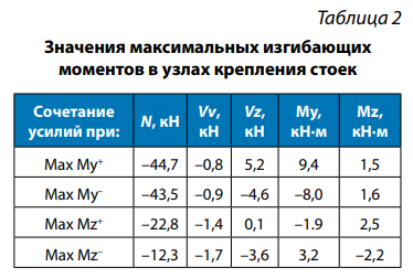 Значения расчетных сочетаний усилий при максимальных изгибающих моментах в узлах крепления стоек представлены в табл. 2.